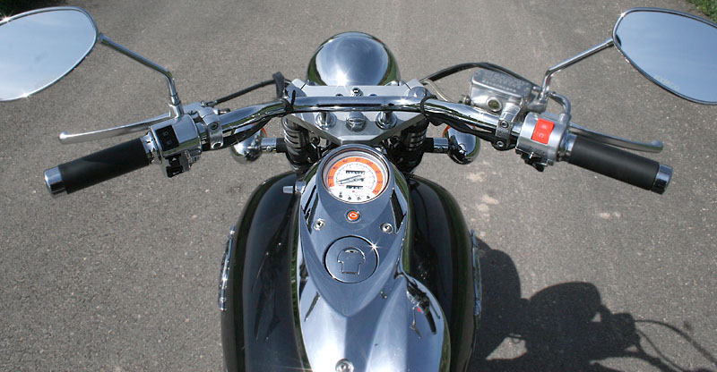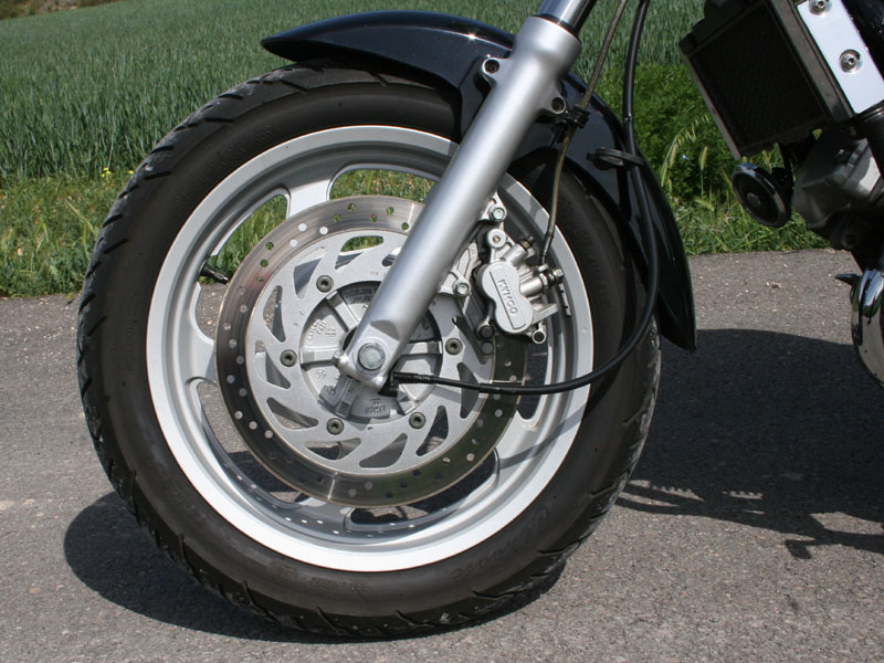 Los cromados, el gran disco delantero de 316 mm y los latiguillos de trenzado metálico son otros detalles que consiguen la admiración y curiosidad de los que pasen cerca de esta moto, de aspecto mucho mayor que el 250 c.c. que monta.
