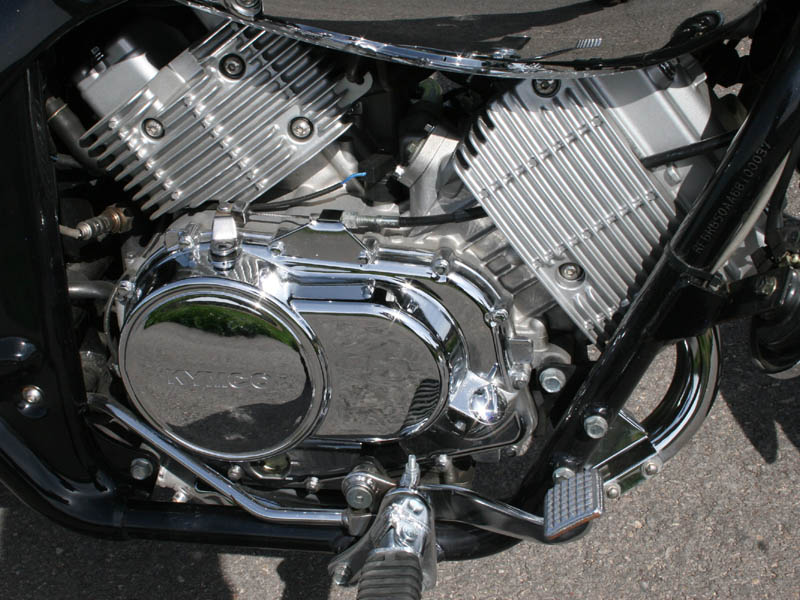 El diseño de esta Kymco está muy conseguido. La desnudez mecánica es una de sus características principales donde las partes que más llaman la atención son su motor bicilíndrico en V a 90º, que dispone de un pequeño aleteado muy bonito a la vista, además de la rueda trasera con llanta lenticular, el manillar ligeramente curvado tipo dragster.