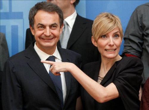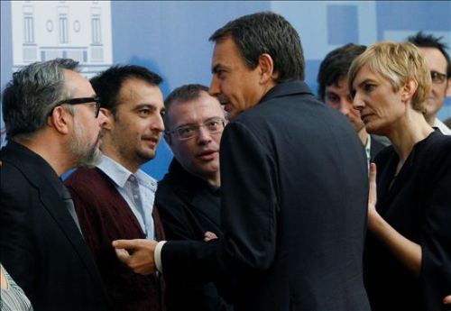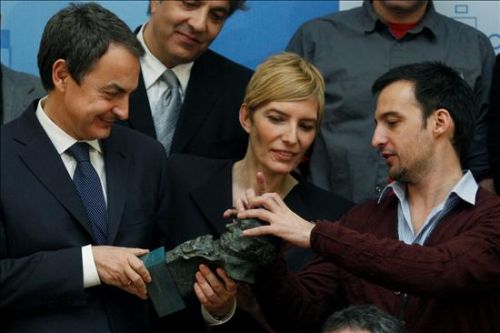 Zapatero, Sonsoles y Amenábar comentando las dimensiones del busto de Goya que se ofrece como galardón a los ganadores.