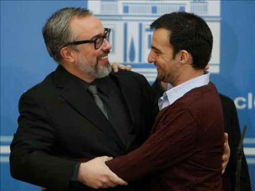 Efusivo abrazo entre Alex de la Iglesia, presidente de la Academia, y Alejandro Amenábar, director de "Ágora".