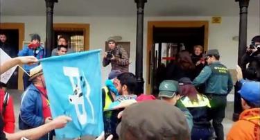 comentarios Intentaron entrar en un banco y en el Ayuntamiento. Descolgaron una bandera de la sede del PP. "Con esta bandera, haremos una hoguera".