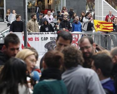 Rosa Díez atiende a la prensa en primer término ante un grupo de independentistas | EFE