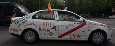 Un taxista protesta contra Uber pintando su propio coche, este miércoles, en Madrid. | D. Alonso