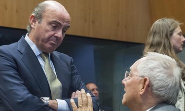 Luis de Guindos habla con su homólogo alemán, Wolfgang Schauble, este jueves, en Bruselas. | EFE