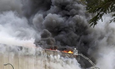 Imagen del incendio que este domingo ha arrasado la planta burgalesa de Campofrío. | EFE