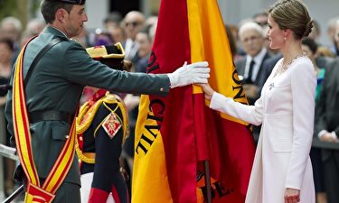 En lugar de la peineta, mantilla y traje negro tradicionales, ha recuperado su vestido claro de la proclamación.