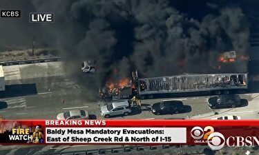 Vehículos ardiendo en la I-15 de California. | Imagen TV