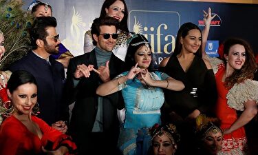 Estrella del cine indio junto al grupo folclórico que ha actuado durante la presentación de la gala en Madrid | EFE