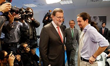 Rajoy e Iglesias se saludan muy sonrientes en el museo de la agencia EFE | EFE