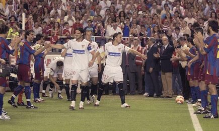 Pasillo del Barça al Sevilla en el Sánchez Pizjuán en la temporada 2005/06. | Archivo ¿Habrá doble pasillo el domingo en el Calderón? Guillermo Domínguez