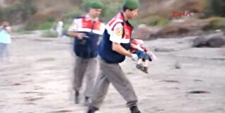 Un agente turco recoge a uno de los niños ahogados este miércoles. | Imagen TV DHA