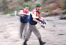 Un agente turco recoge a uno de los niños ahogados este miércoles. | Imagen TV DHA