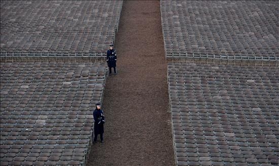 Dos guardias vigilan entre centenares de asientos vacíos. (EFE)