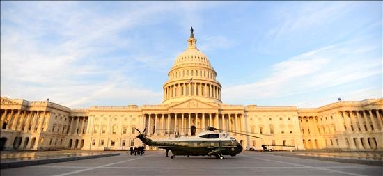 El helicóptero de la Marina que conducirá al presidente George W. Bush a la base Andrews de las Fuerzas Aéreas aterriza junto al Capitolio. (EFE)