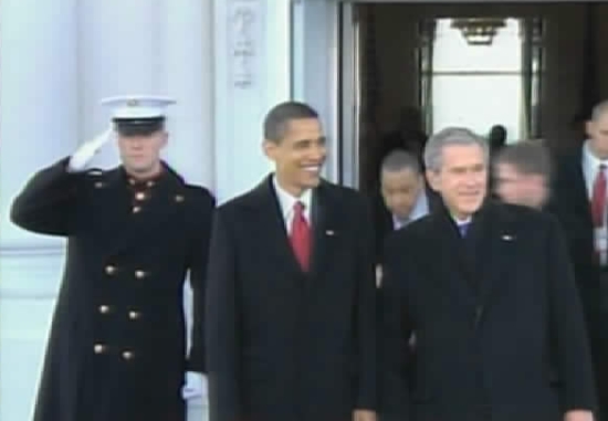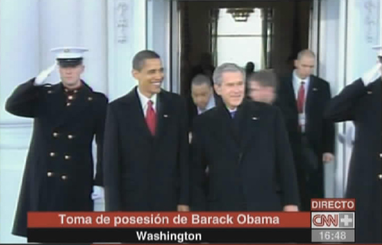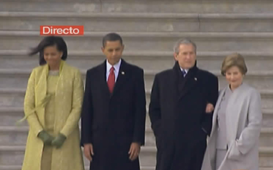 Barack Obama y George W. Bush salen al escenario donde se celebró el acto de toma de posesión del nuevo presidente de Estados Unidos. (Imagen TV)