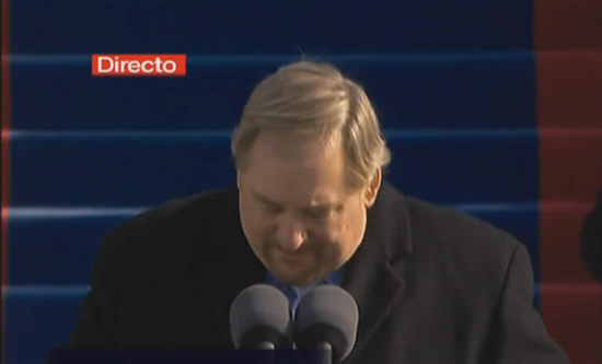 Obama escucha respetuosamente la oración del pastor evangelista Kim Warren. (Imagen TV)
