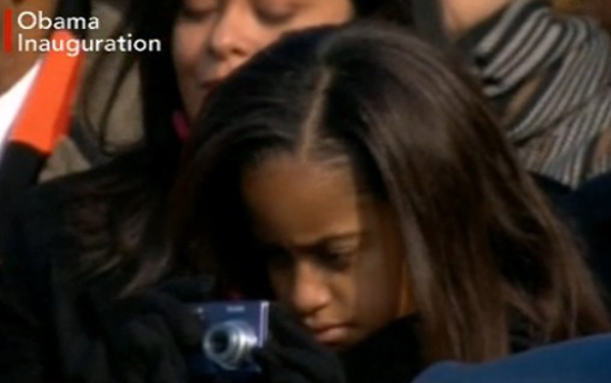 Muy atenta a la ceremonia de toma de posesión de su padre, Malia Obama, hija mayor del nuevo presidente de los EEUU, graba con su cámara fotográfica el discurso de su padre. (Imagen TV)
