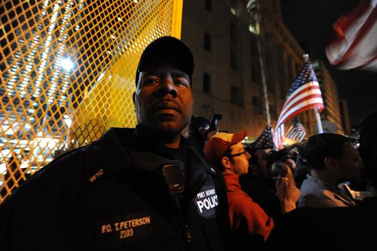 Un hombre sostiene una pancarta en la zona Zero en Nueva York mientras celebra con cientos la muerte de Osama Ben Laden