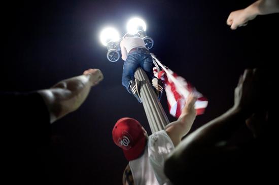 Un hombre se sube a un poste en la avenida Pennsylvania, a las afueras de la Casa Blanca, en Washington