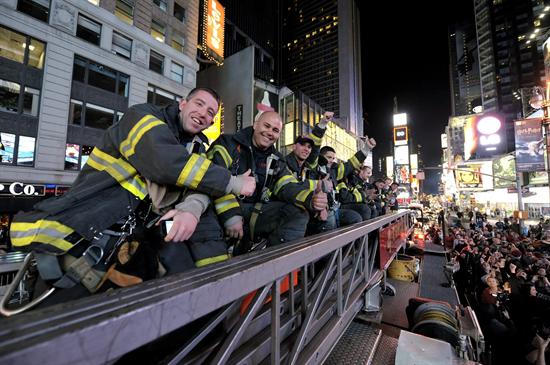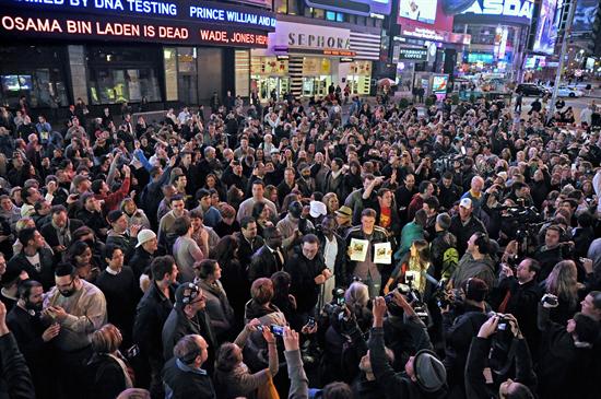 El actor estadounidense Rob Lowe (centro) se une a bomberos y miles de personas en Times Square para celebrar la muerte de Osama Ben Laden