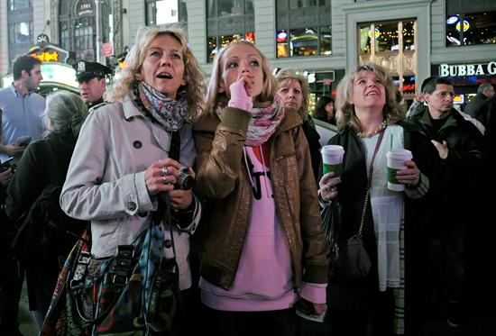 Cientos de personas observan la información en las pantallas electrónicas de Times Square mientras celebran la muerte de Osama Bin Laden en Nueva York