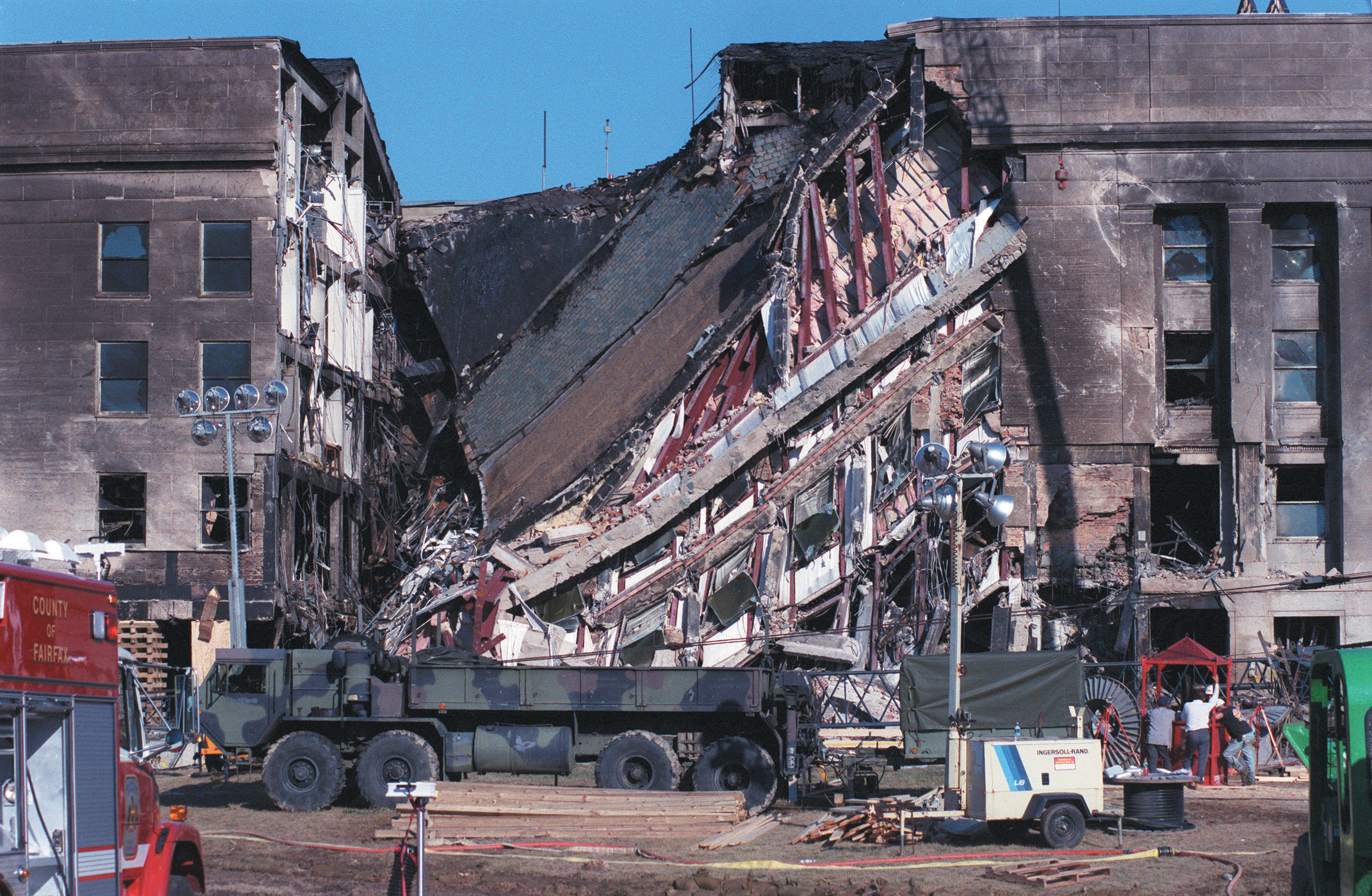 Otra supuesta prueba es que no hubo restos del avión fuera del Pentágono, de modo que no pudo ser un avión. Allyn E. Kilsheimer, experto en explosiones que ayudó a coordinar la respuesta de emergencia al ataque, recuerda que además de restos del avión "Tuve entre mis manos partes del uniforme de la tripulación, incluyendo partes del cuerpo, ¿ok?". Al margen de que si hubo algunos restos fuera del edificio, como puede verse en la imagen,