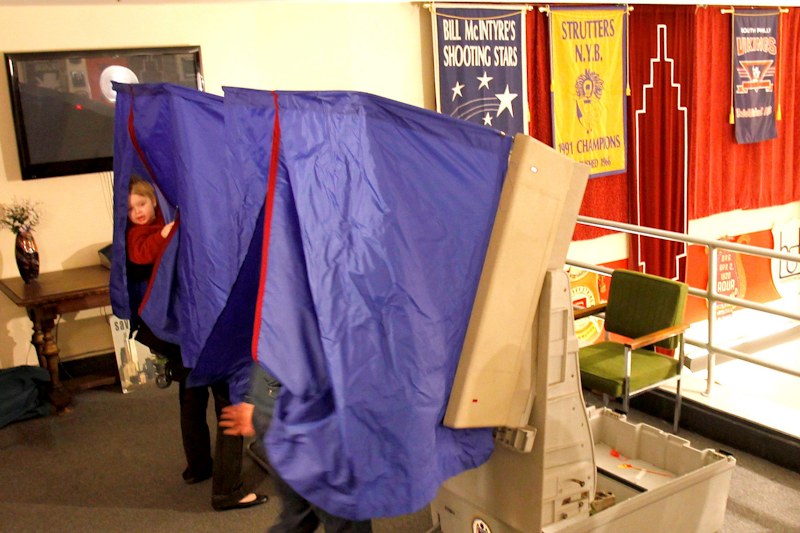 Un niño asoma la cabeza por un biombo para votar en secreto en el colegio electoral del Museo Mummers de Filadelfia.