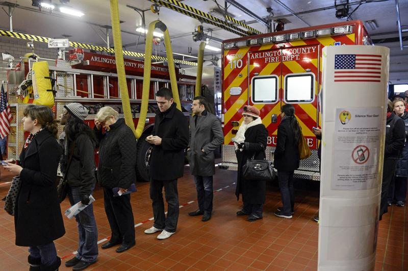 Unas personas hacen cola para votar en un colegio electoral instalado en un parque de bomberos en Arlington, Virginia Occidental.
