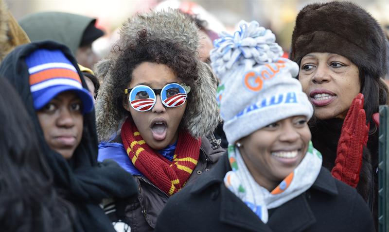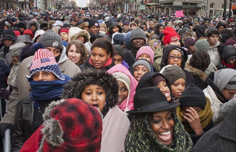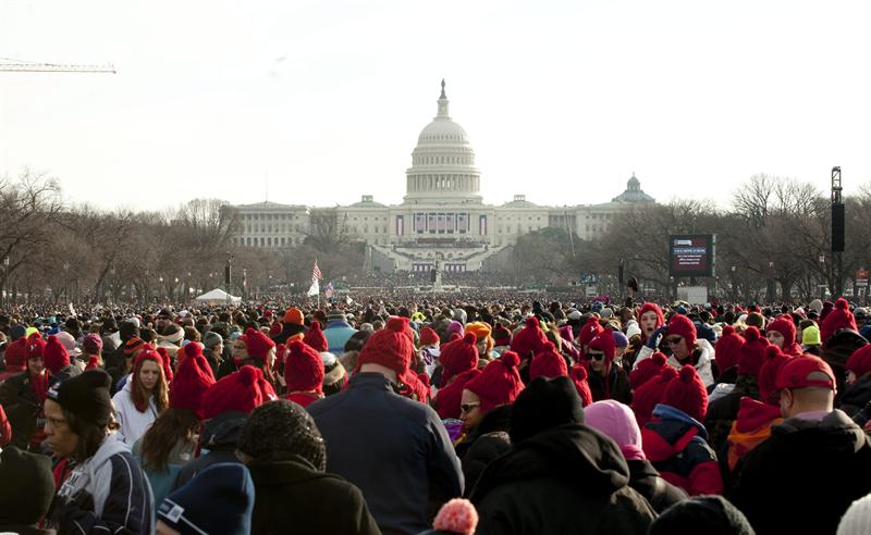Miles de personas se reúnen en el National Mall horas antes del discurso inaugural del presidente estadounidense, Barack Obama, en Washington, Estados Unidos, hoy lunes 21 de enero de 2013. El presidente Barack Obama, y el vicepresidente, Joe Biden, han jurado sus cargos en una ceremonia pública frente al Capitolio.