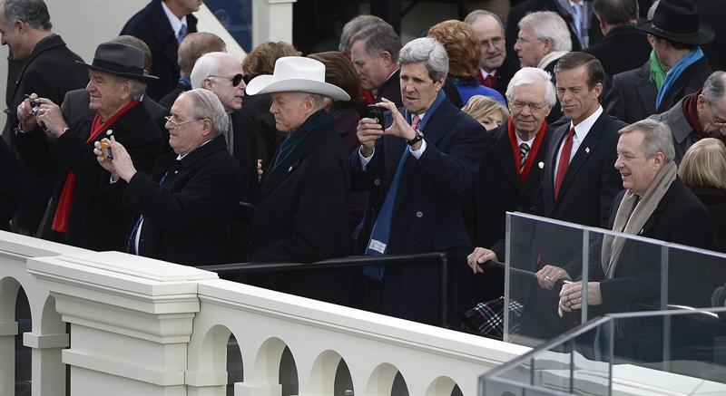 El senador demócrata John Kerry (c), a su llegada a la fachada Oeste del Capitolio horas antes del discurso inaugural del presidente estadounidense, Barack Obama, en Washington