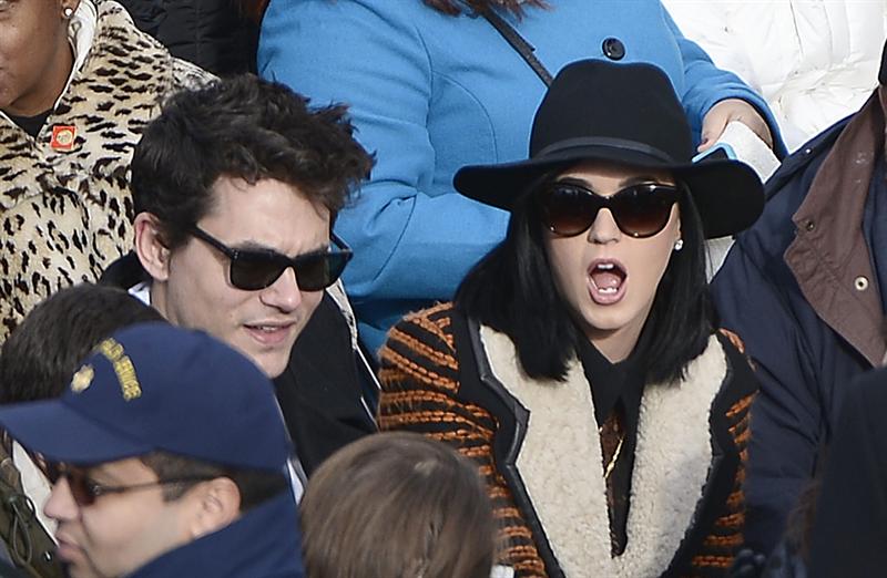 Los cantantes estadounidenses John Mayer (i) y Katy Perry, buscan su asiento en la fachada Oeste del Capitolio