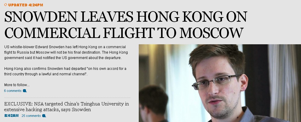 El extécnico de la CIA abandonó este domingo Hong Kong en el vuelo SU213 de Aeroflot, que tiene previsto aterrizar en la capital rusa, a las 17:15 hora local (13:15 GMT). La víspera, EEUU solicitó formalmente a Gobierno de Hong Kong la extradición de Snowden, quien afronta en su país tres cargos de espionaje y robo de propiedad gubernamental, por cada uno de los cuales podría ser condenado a hasta 10 años de prisión.