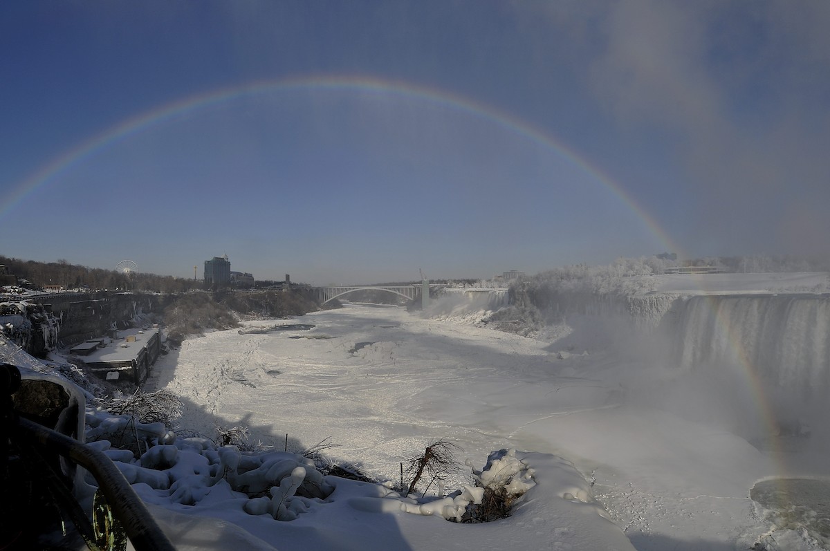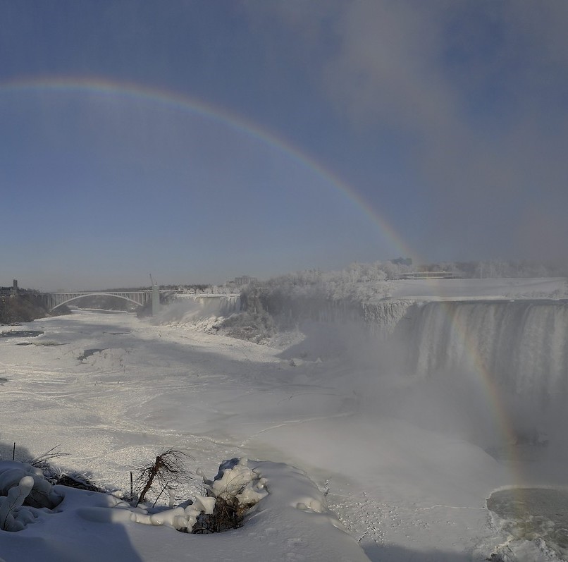 Un arcoiris preside una instantánea de las cataratas del Niágora heladas
