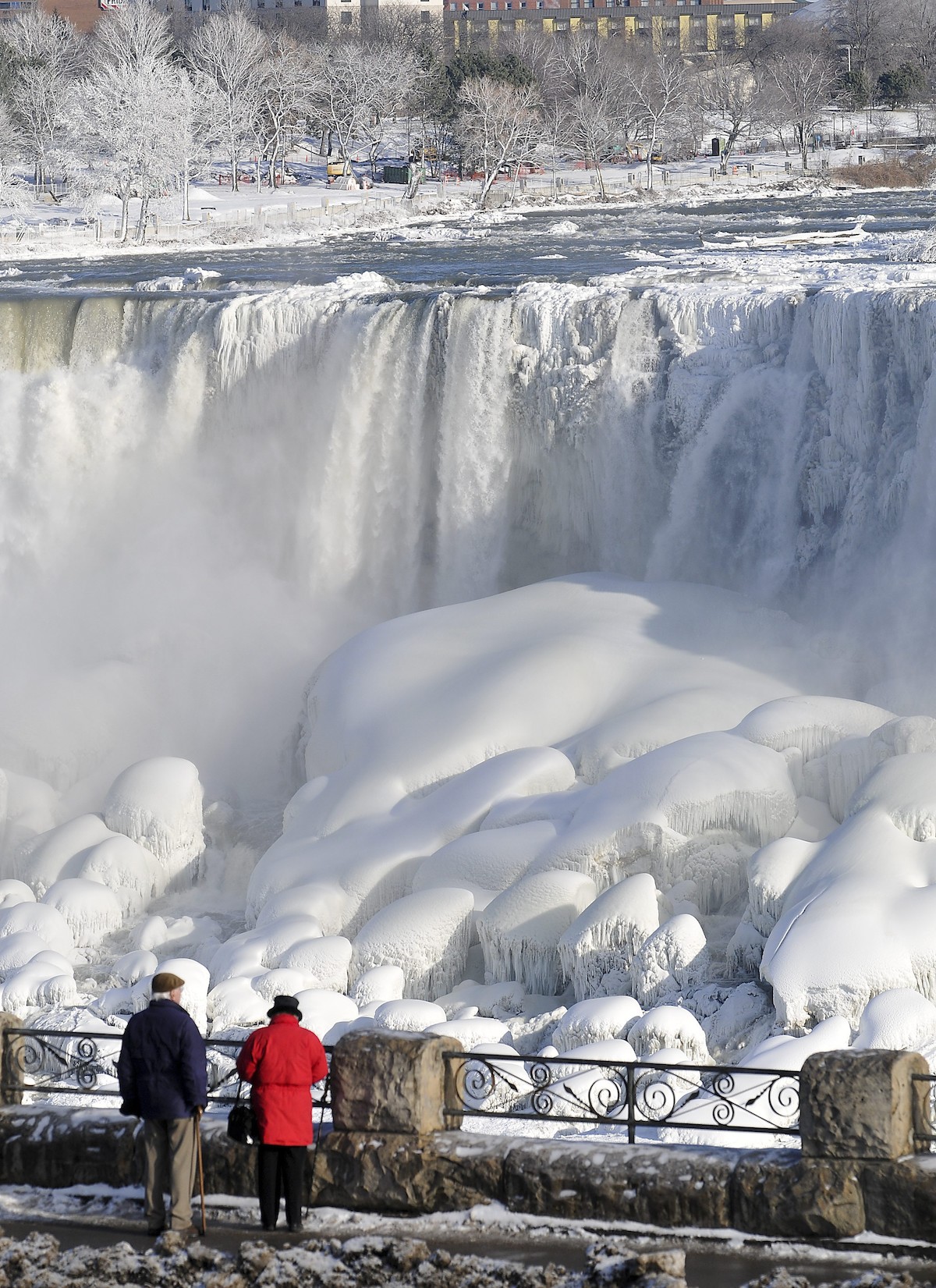 Dos personas contemplan las cataratas del Niágara, heladas debido a la ola de frío que sacude a EEUU