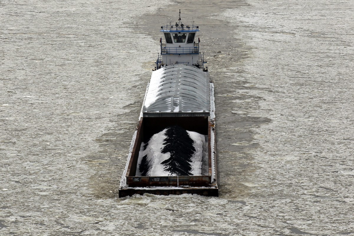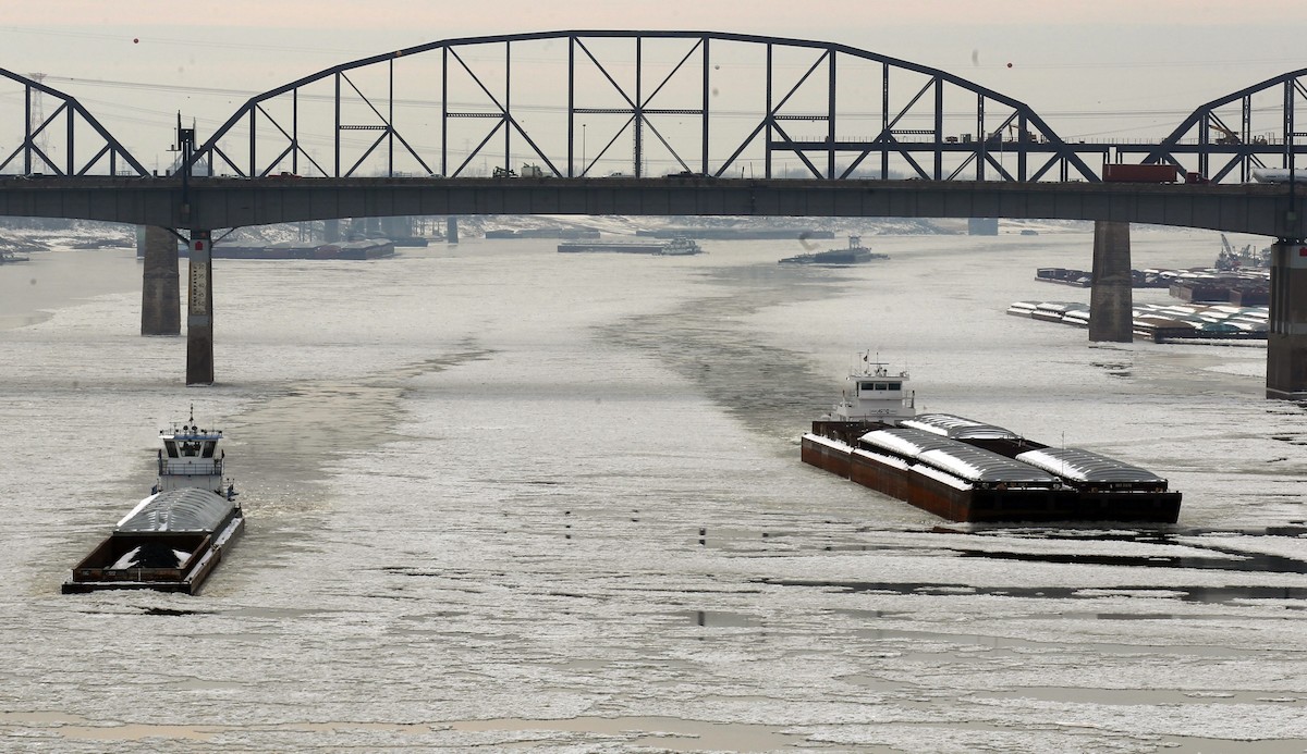 Un barco navega por el río Misisipi, helado, a la altura de San Luis