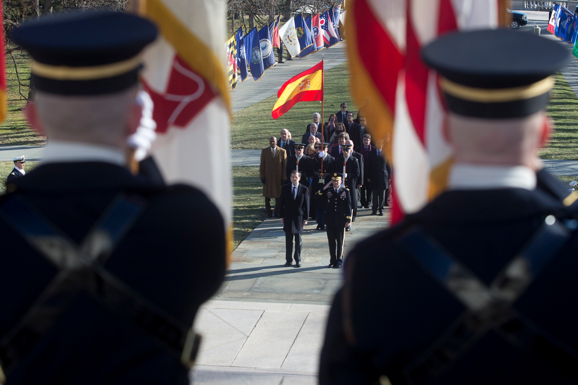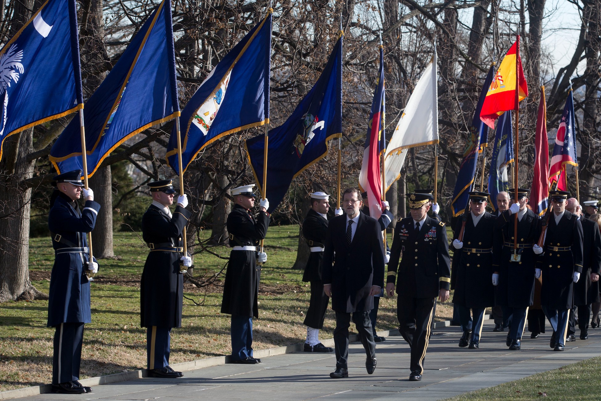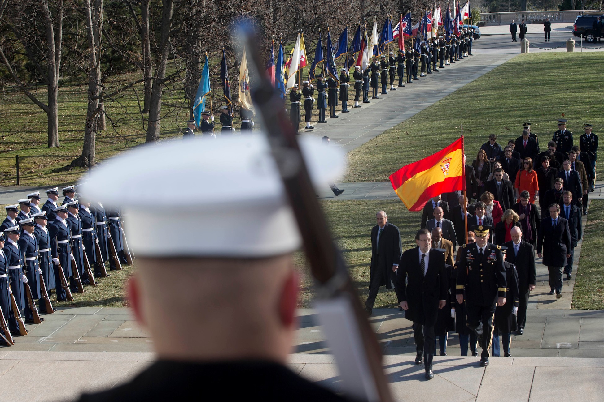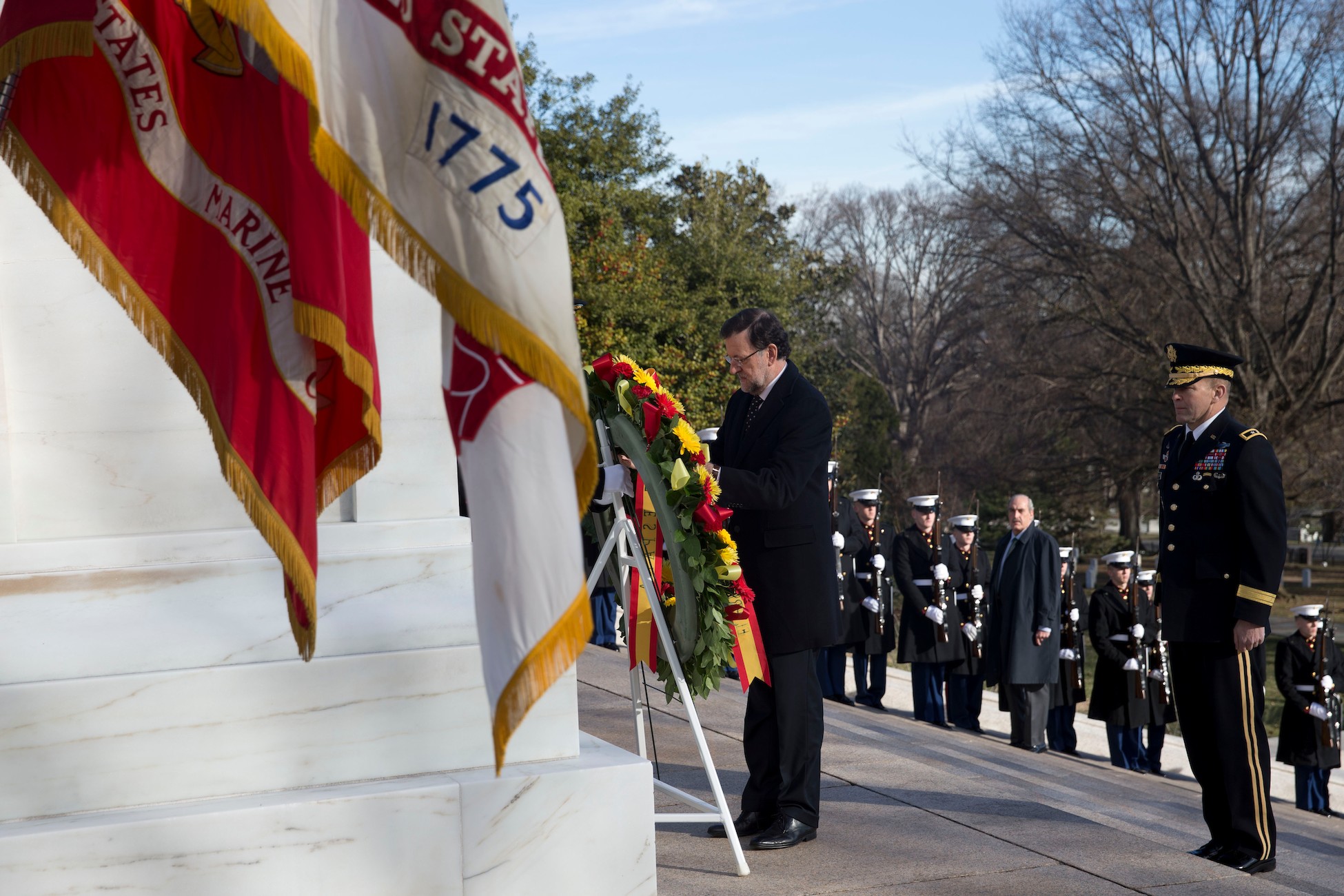 Mariano Rajoy realiza una ofrenda floral en la tumba al soldado desconocido del cementerio nacional de Arlington
