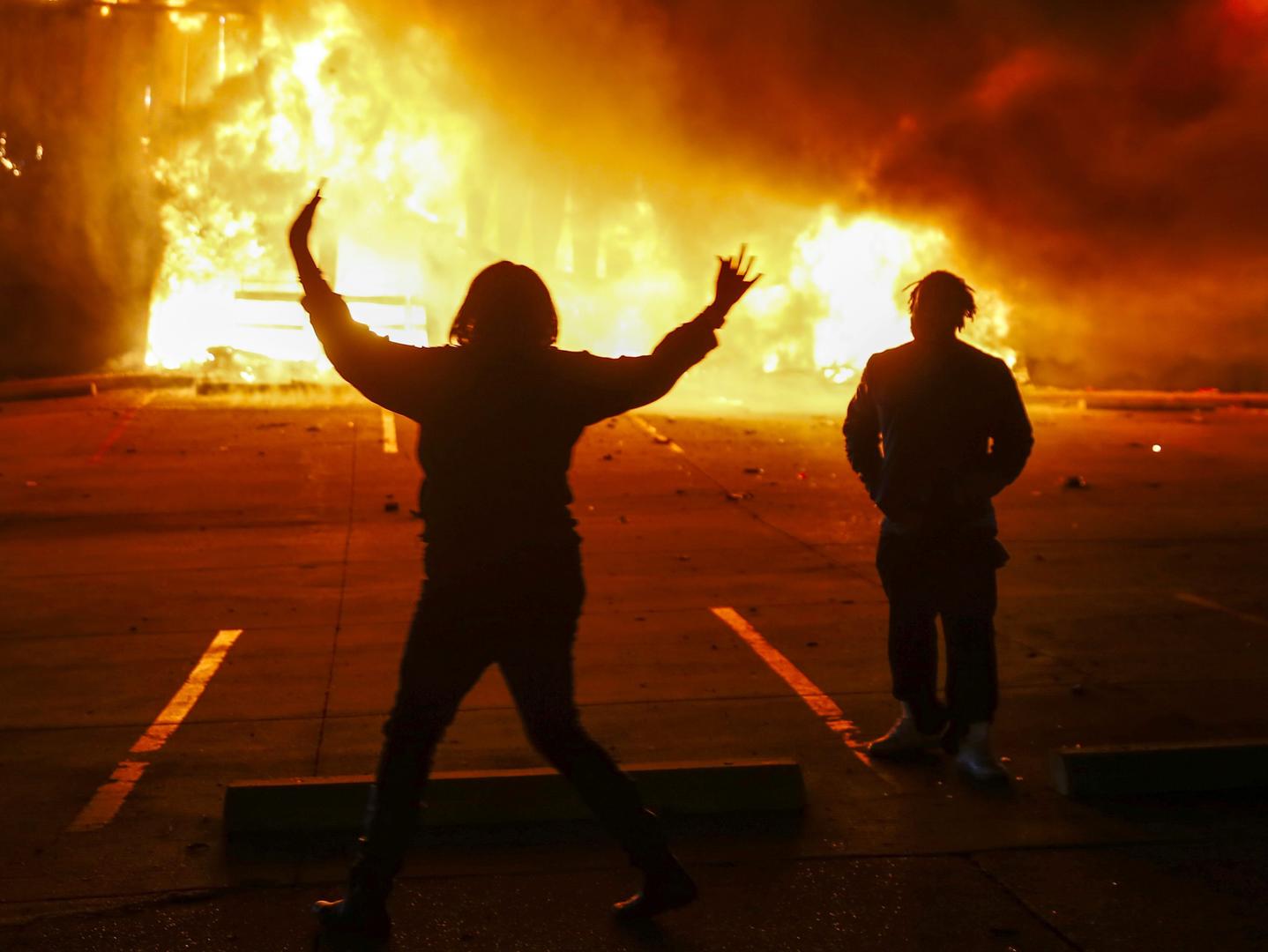 Vehículos y edificios en llamas, comercios saqueados y enfrentamientos entre manifestantes y agentes son las imágenes de esta noche en la avenida West Florissant de Ferguson y sus alrededores, epicentro de la ola de disturbios raciales que desató el 9 de agosto la muerte de Brown, desarmado y con 18 años, a manos del agente blanco Darren Wilson.