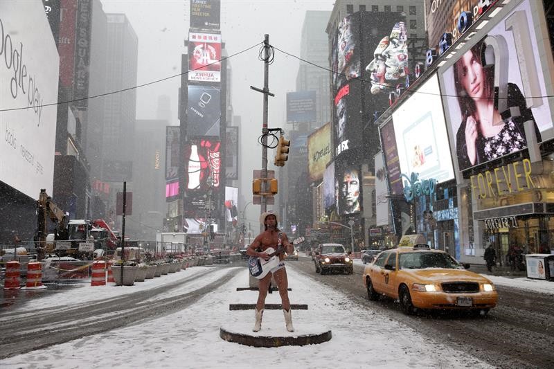 Poco antes de que comenzara el temporal, este lunes había algún valiente como el artista callejero Robert John Burck, conocido como "El Vaquero Desnudo", cantando en Times Square.