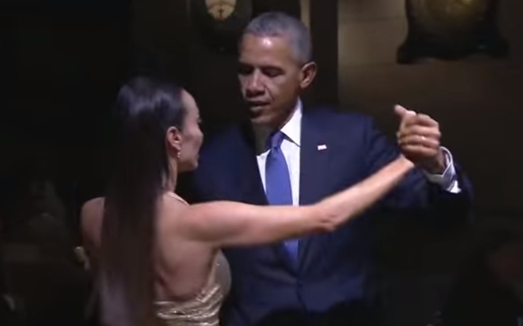 Al término de la cena de Estado, Obama y su esposa, Michelle, observaron con gran atención como una pareja de bailarines de tango se movía con precisión en un pequeño espacio abierto delante de su mesa. En uno de los momentos más sorprendentes de la noche, el presidente de Estados Unidos se levantó y se desplazó de un lado al otro junto a la bailarina, dando incluso algunos giros, mientras que la primera dama hizo lo mismo con el bailarín.