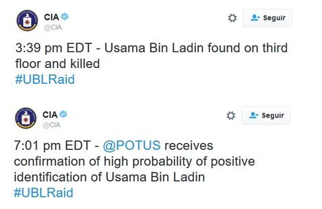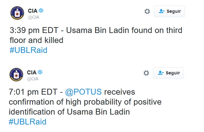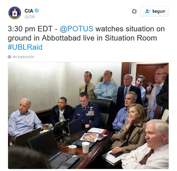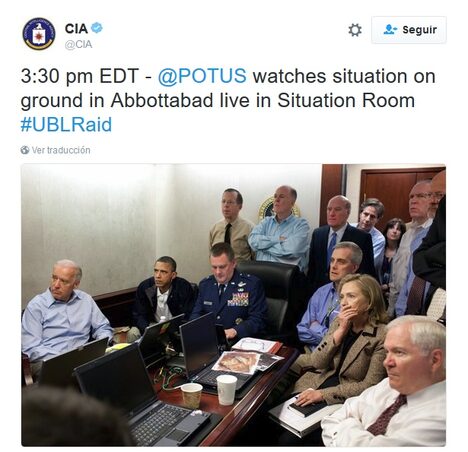 Tras publicar la foto, la CIA añadió: "3:39 pm EDT - Osama Bin Laden encontrado en el tercer piso y abatido #UBLRaid". Y después: "7:01 pm EDT - @POTUS (el presidente) recibe confirmación de alta probabilidad de identificación positiva de Osama bin Laden #UBLRaid".