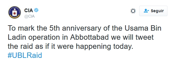 La Agencia Central de Inteligencia (CIA) de Estados Uunidos ha conmemorado a través de su cuenta en Twitter la operación en la que murió hace cinco años el líder de Al Qaeda, Osama Ben Laden, en la localidad paquistaní de Abbottabad. Según ha recordado la CIA, "el éxito de la misión fue la culminación de muchos años de operaciones complejas, exhaustivas y avanzadas de Inteligencia y análisis" que arrancó tras los atentados del 11-S.