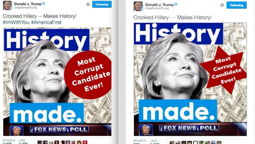 En el polémico tuit, sobre un fondo de billetes de cien dólares y utilizando una de los lemas de la candidata demócrata, "Haz historia", el polémico líder republicano añadía una estrella de seis puntas –como la estrella de David–. con la siguiente frase: "La candidata más corrupta –que hubo– nunca".