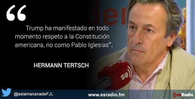 Por su parte, Hermann Tertsch ha comentado la compareción que suele hacerse del candidato republicano con el líder de Podemos: "Trump ha manifestado su lealtad a la Constitución americana; Pablo Iglesias quiere destruir la nuestra" matizaba tajante. El periodista ha declarado que "la personalidad de Trump es un accidente; no lo que hay detrás" y ha recordado que Obama, en las primarias, "dijo de Hillary muchas de las cosas que ahora dice Trump".