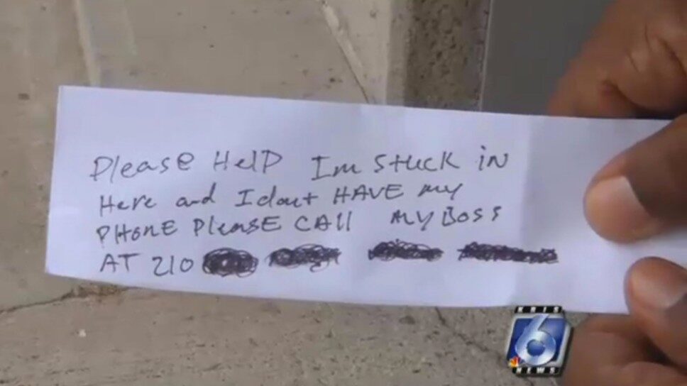 Según relata el New York Times, no había empleados en la sucursal pero por suerte el cajero ya estaba operativo y el trabajador decidió intentar comunicarse con el exterior mediante papeles en los que explicaba que estaba encerrado y que no tenía teléfono. Pedía que avisaran a su jefe a un número de móvil.