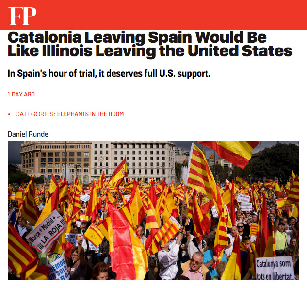 El texto, firmado por Daniel Runde –exdirector de la agencia de desarrollo estadounidense USAID y actual miembro del Centro de Estudios Internacionales y Estratégicos–, lleva un contundente titular: "Cataluña fuera de España sería como Illinois fuera de Estados Unidos".