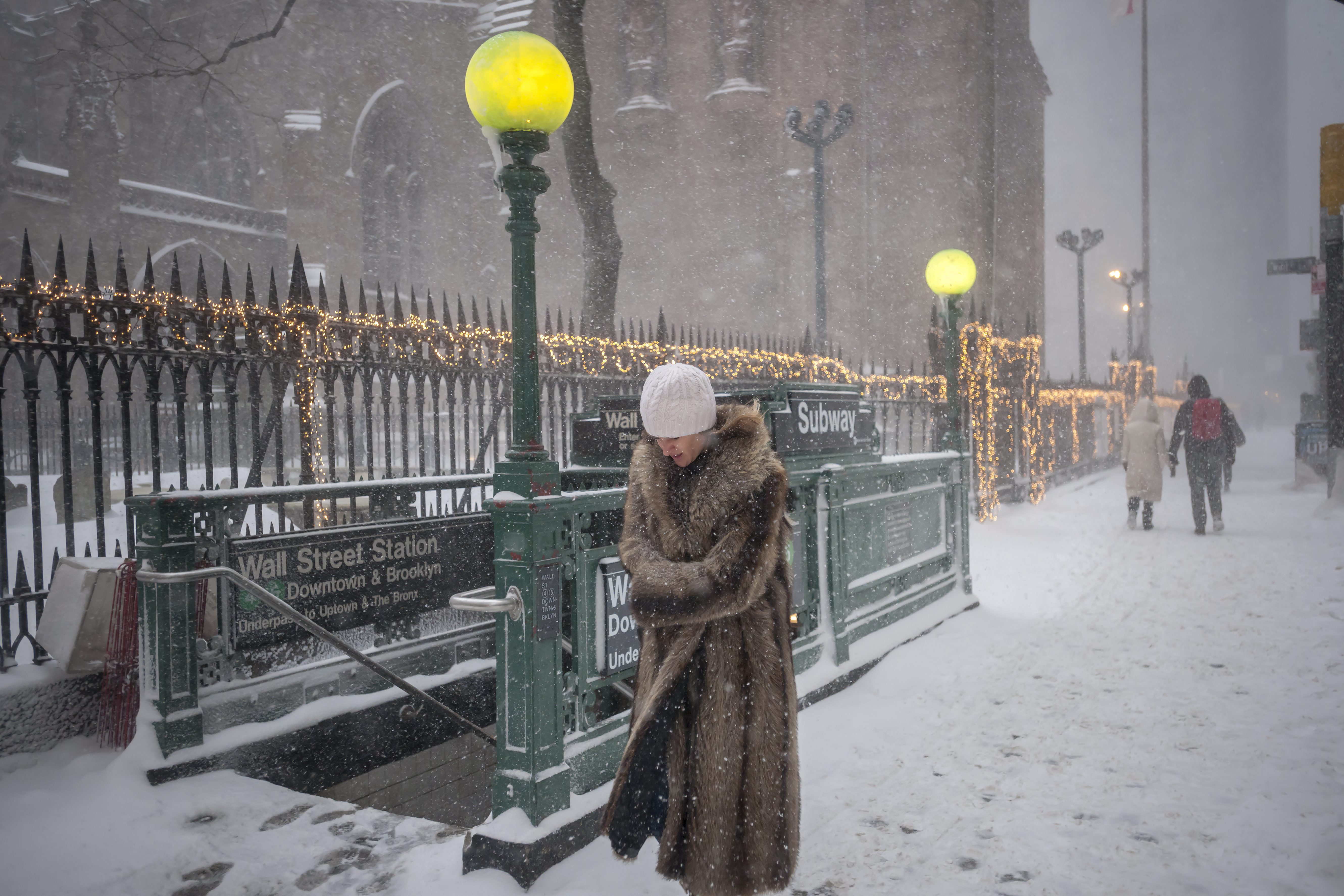 Una mujer se protege de la nieve en las cercanías de Wall Street.