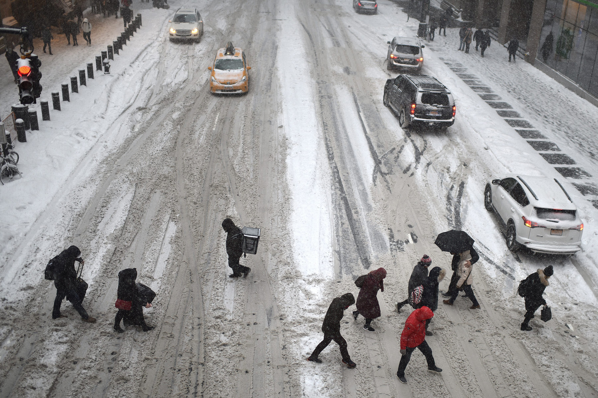 Varios peatones cruzan un paso de cebra totalmente cubierto de nieve en las cercanías de la calle 42 de Nueva York.