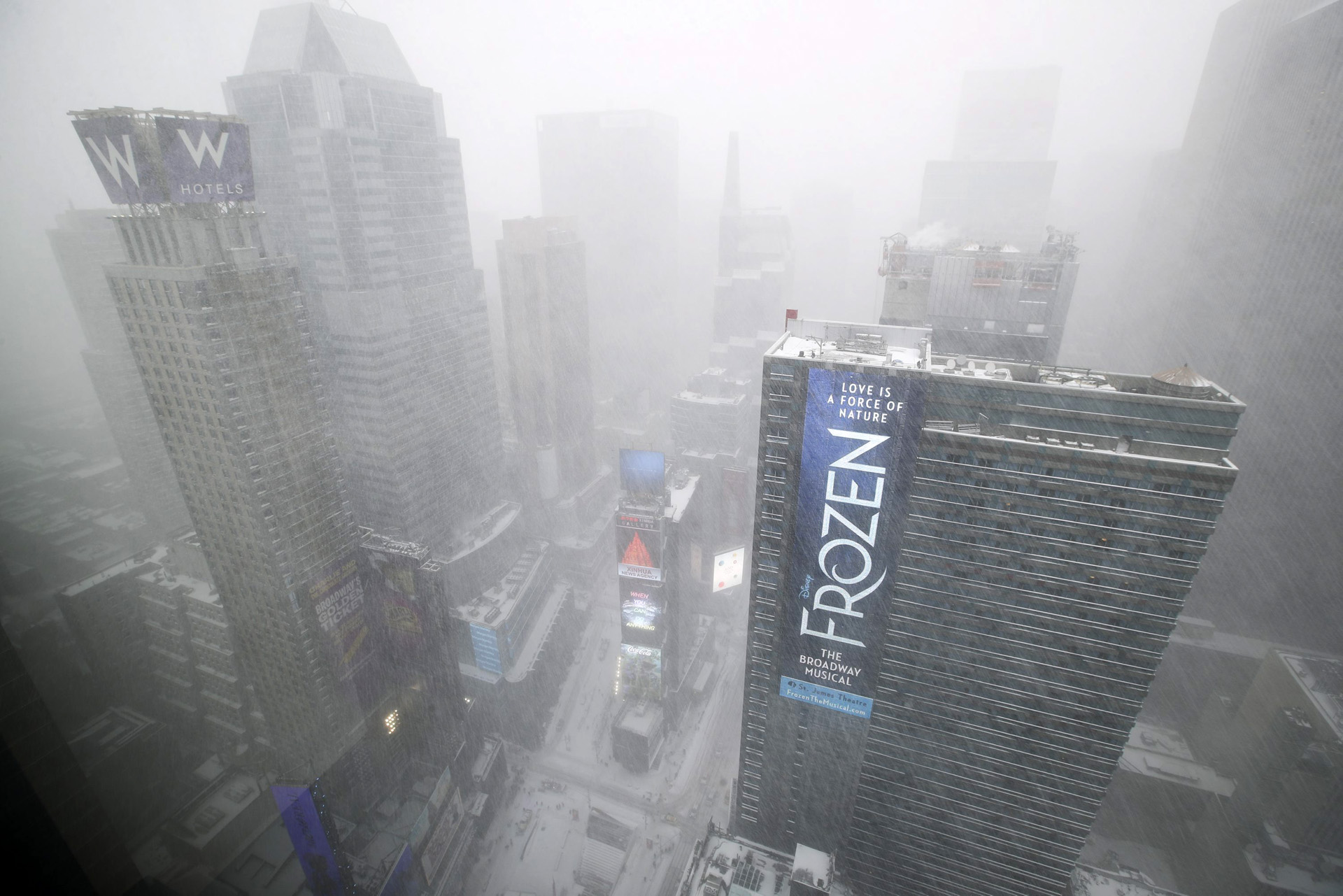Una vista aérea de la zona de Times Square en plena tormenta de nieve.