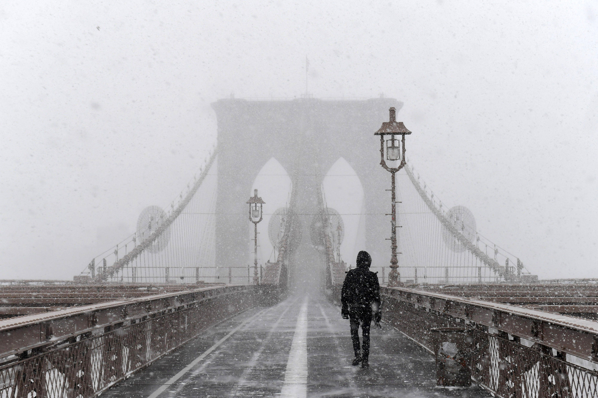 Un hombre camina sobre el puente de Brooklyn en pleno temporal de nieve y frío que está asolando Nueva York durante esta semana.