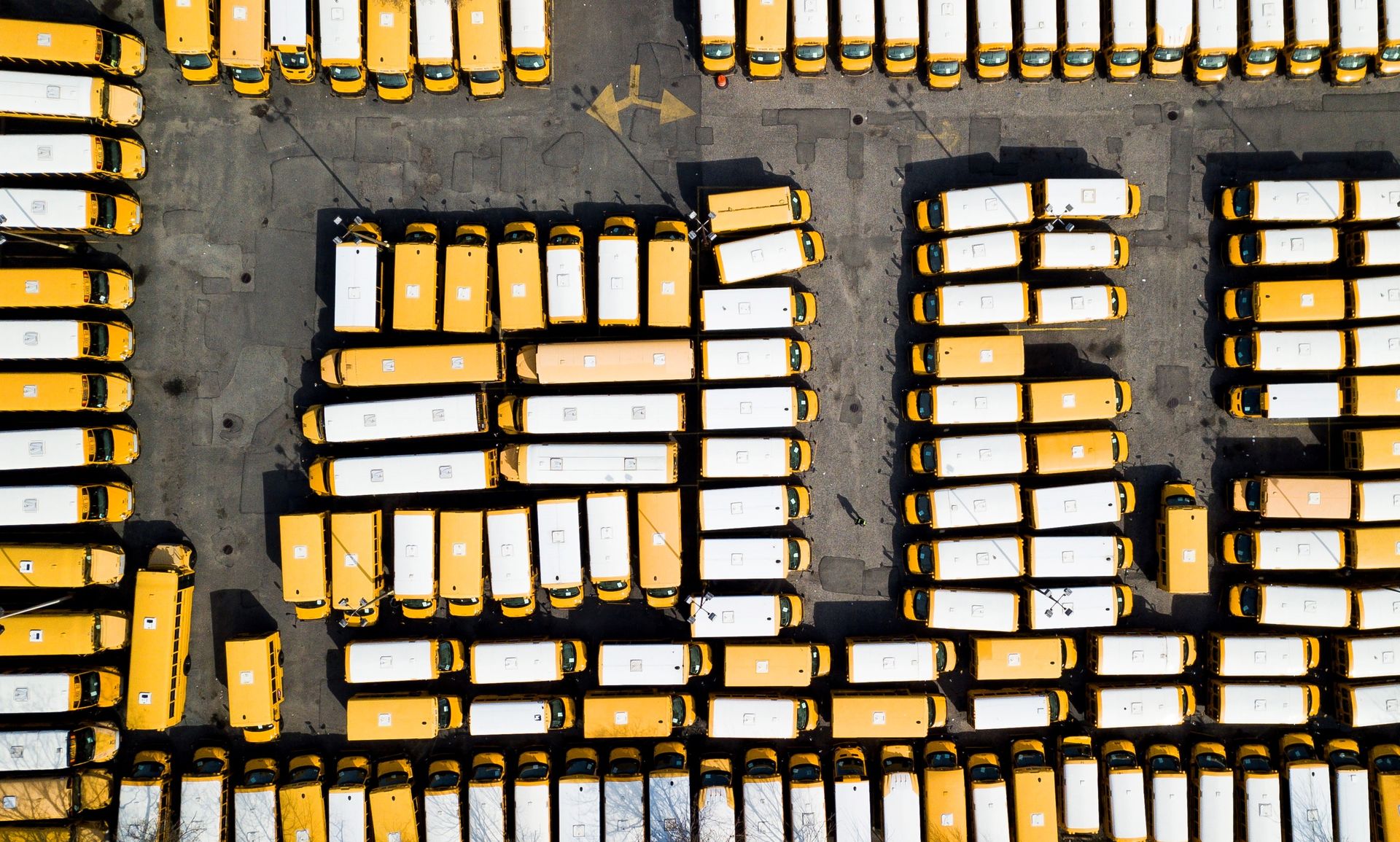 Una fotografía aérea con un dron muestra que los autobuses escolares llenan el área de estacionamiento, ya que todas las escuelas en el área están cerradas, en Freeport, Nueva York, EE. UU.